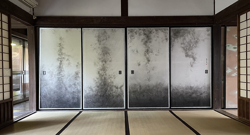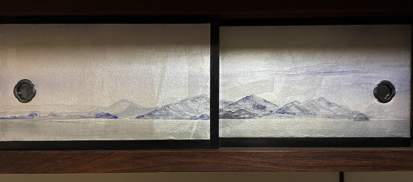 2021年4月に取材を始めてから約半年かけて制作した障壁画三点を11月12日(金)に香川県多度津町にある屏風ヶ浦海岸寺へ奉納しました。収めた部屋は、旧多度津藩藩主京極氏をお迎えする京極上段の間です。上段の間床脇棚の扉にも二点描きました。作品は、多度津町の風景を題材としたものと、お寺に安置されている鎌倉期の不動尊像「金刀比羅不動迦楼羅像」をイメージして制作したものです
