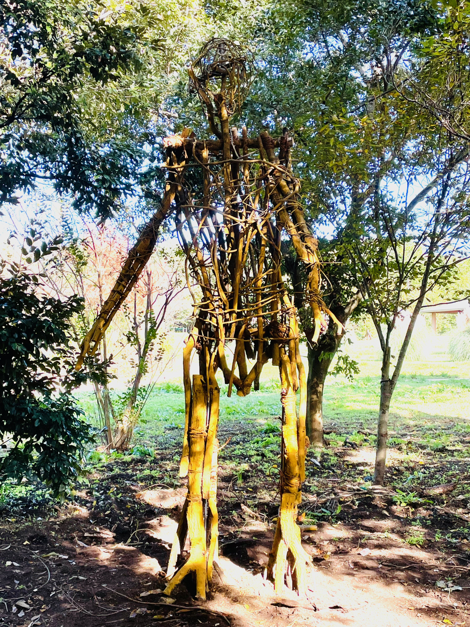 私もこのイベントに参加し、最近この地域で発生しているナラ枯れの問題に注目しました。 公園内では、危険と判断された樹木を伐採しその廃材が廃棄場に集められていた。私はその廃材を材料として、少し太めの枝を使い人の体の骨格を作り、胴体、脚、腕に蔓を巻きつけ、小枝を差し込んで自然を擬人化した2体の巨人を制作しました。この蔓が絡み合う姿は、まるで動脈や静脈が命を循環させているようで生き物としての自然を表現しています。