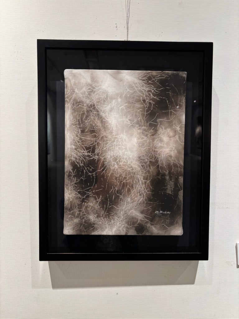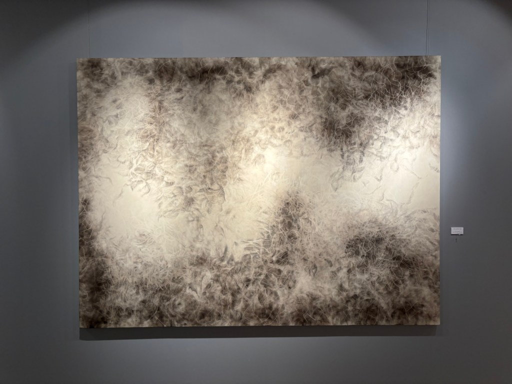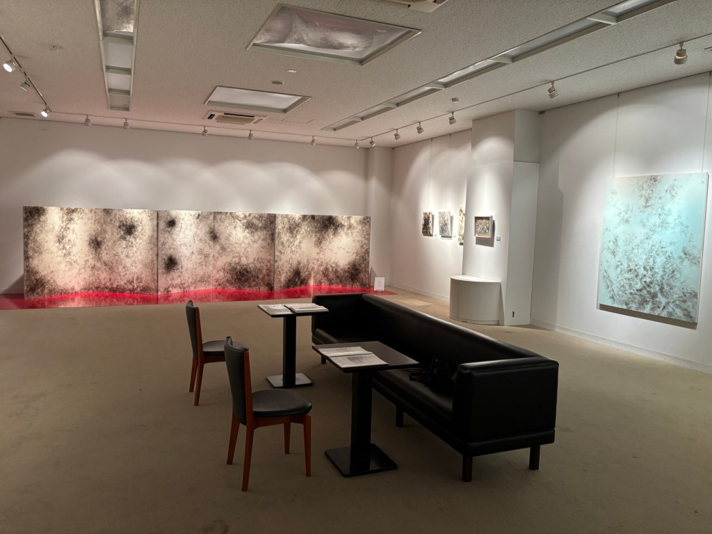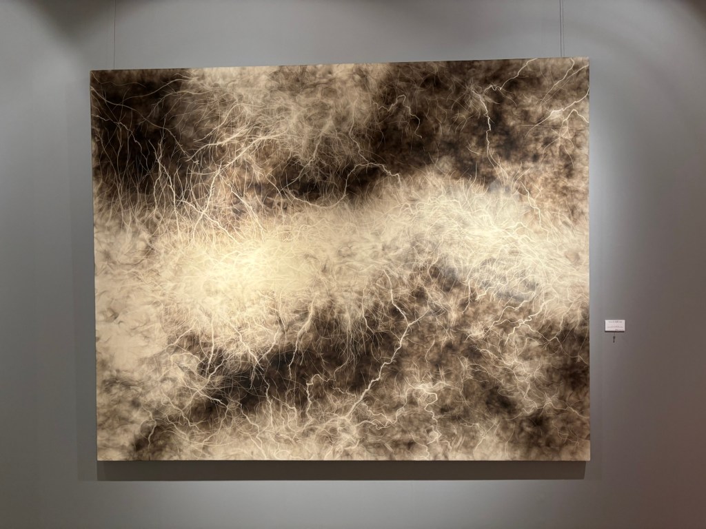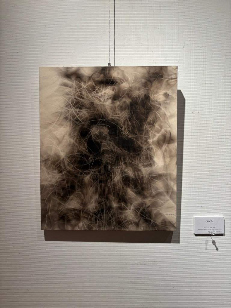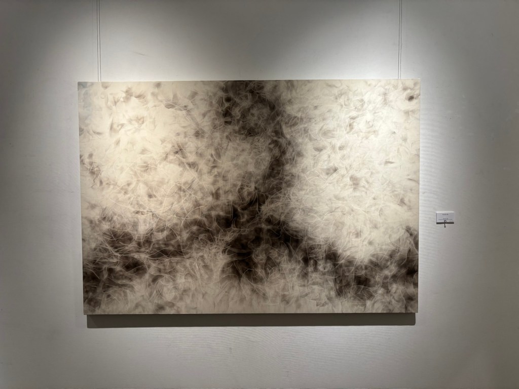 私は4年前より「生命」を主題の根底に据えて制作を続けてきました。制作過程においては、まずエスキースを通じて構想を構築し、描き始める前に一定のイメージを立ち上げます。しかしながら、10年来探究している独自の技法――炎を直接画面にあて、煤を焼き付けることで漆黒を定着させる方法――を用いると、焔の揺らぎが予期せぬ形象を生み出し、当初想定したイメージとは異なる世界へと移行していきます。その後、偶然性に導かれながら多様な道具によって黒を削ぎ落とし、生命の気配を探る過程において、初期のイメージはしばしば消失し、全く異なる形態へと変容したり、あるいは深化を経て再び顕現したりします。私はこの過程において混沌の迷宮に深く沈潜し、時間をかけて探究した末に、新たな形態として浮上するのです。