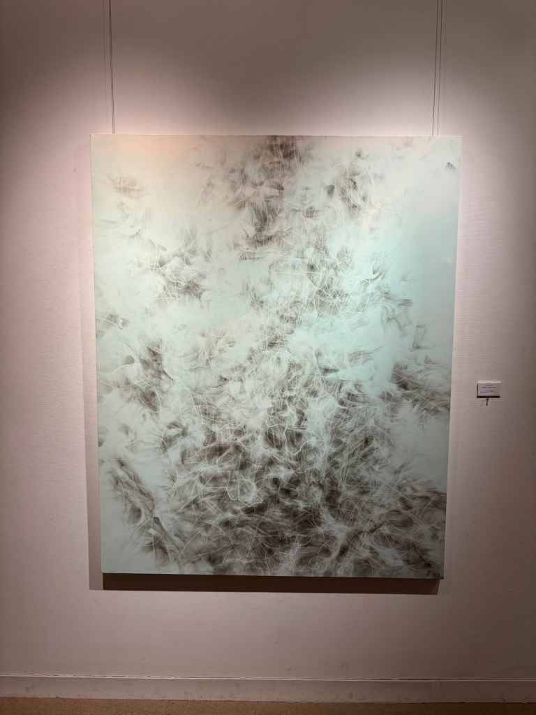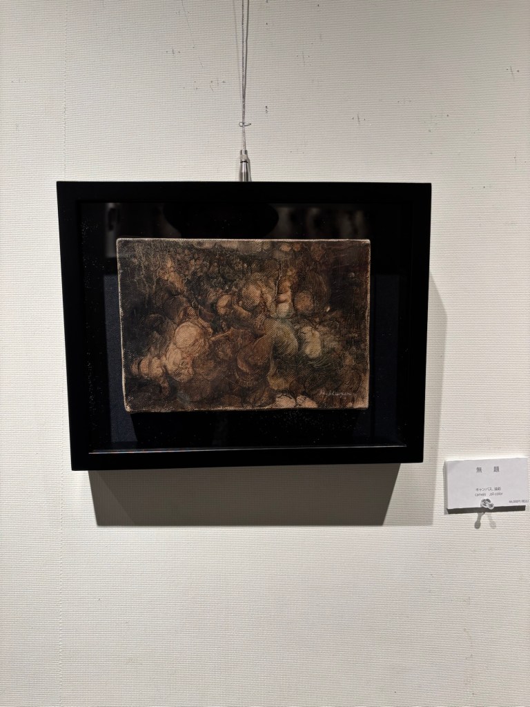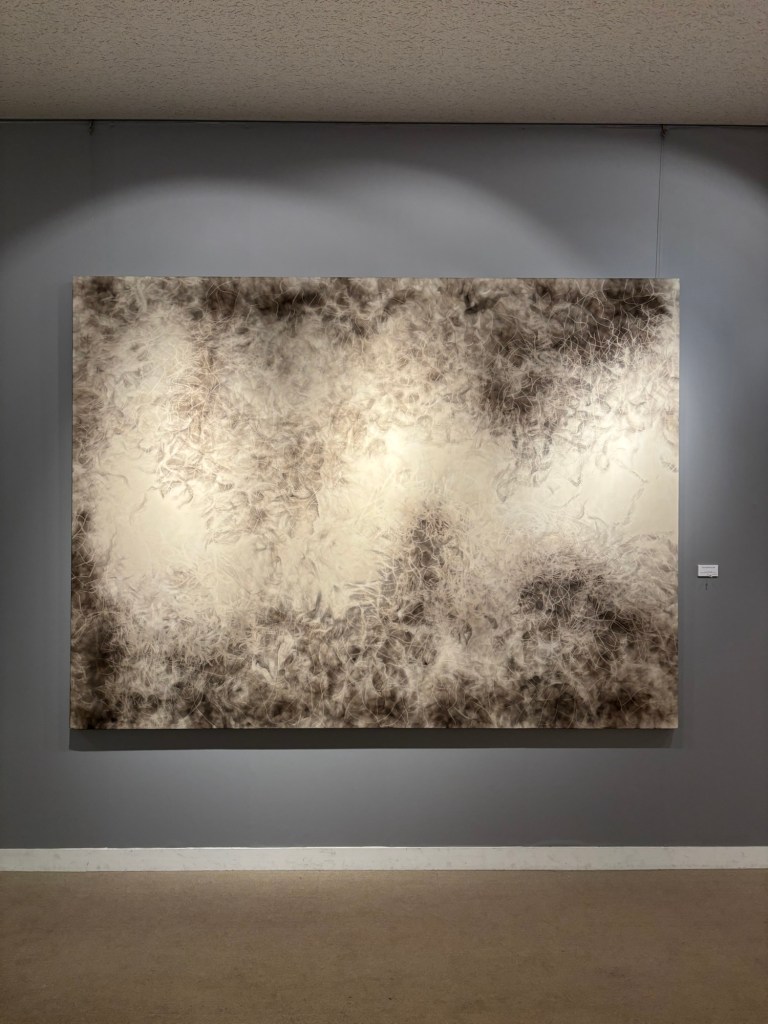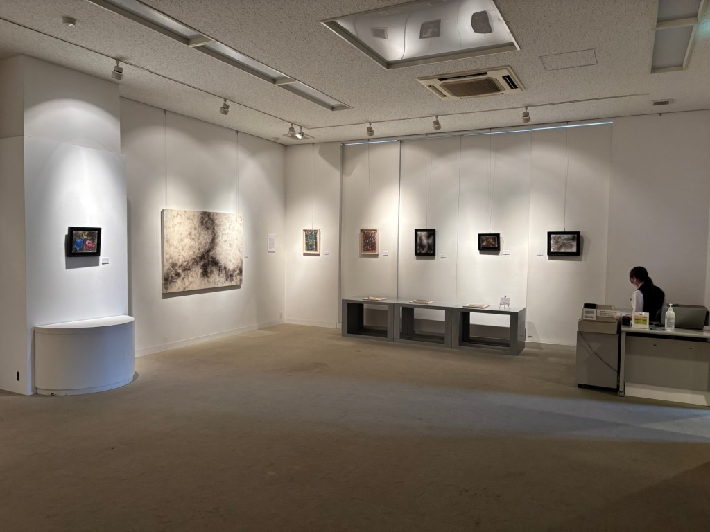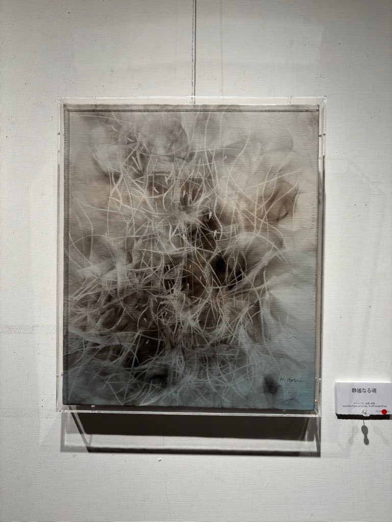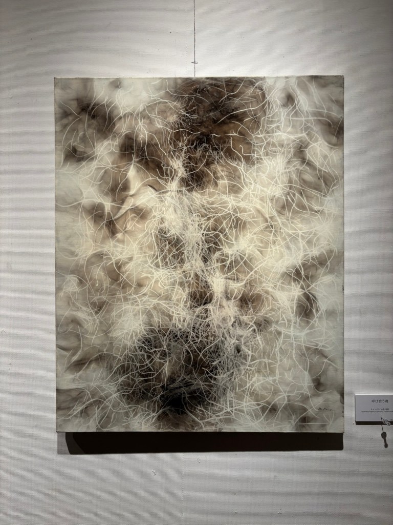 私は4年前より「生命」を主題の根底に据えて制作を続けてきました。制作過程においては、まずエスキースを通じて構想を構築し、描き始める前に一定のイメージを立ち上げます。しかしながら、10年来探究している独自の技法――炎を直接画面にあて、煤を焼き付けることで漆黒を定着させる方法――を用いると、焔の揺らぎが予期せぬ形象を生み出し、当初想定したイメージとは異なる世界へと移行していきます。その後、偶然性に導かれながら多様な道具によって黒を削ぎ落とし、生命の気配を探る過程において、初期のイメージはしばしば消失し、全く異なる形態へと変容したり、あるいは深化を経て再び顕現したりします。私はこの過程において混沌の迷宮に深く沈潜し、時間をかけて探究した末に、新たな形態として浮上するのです。