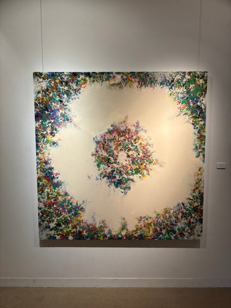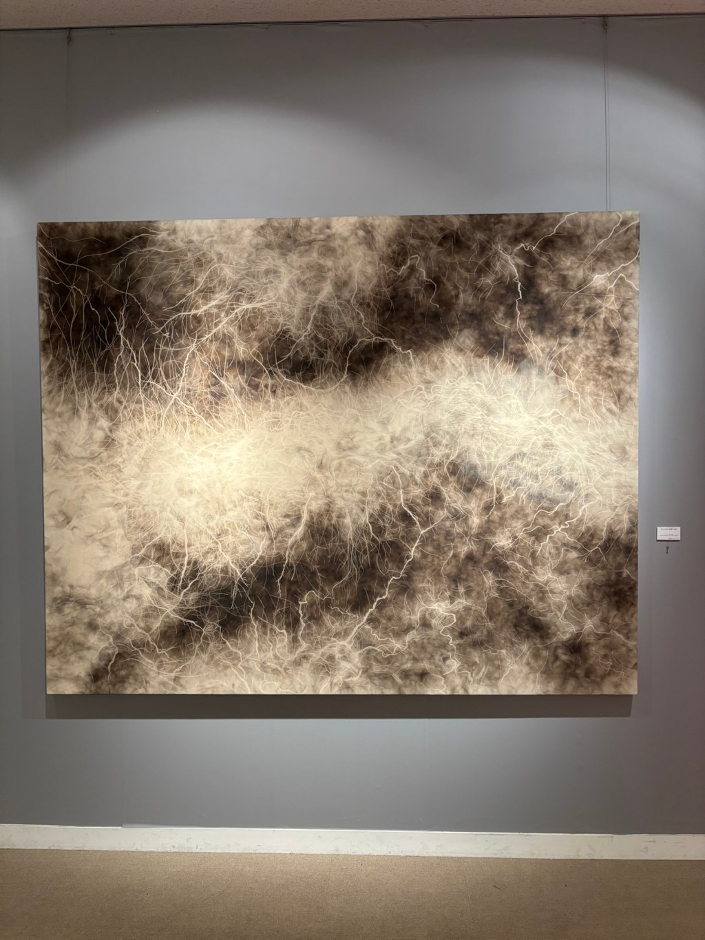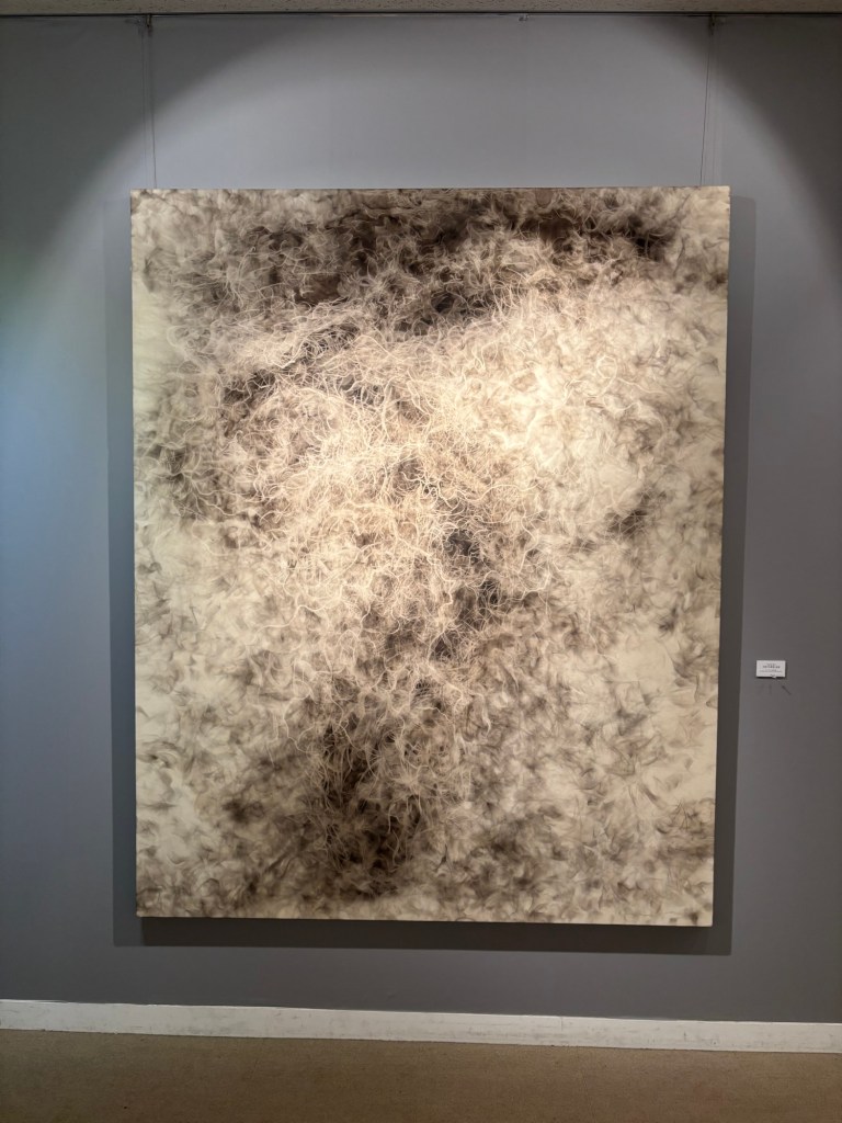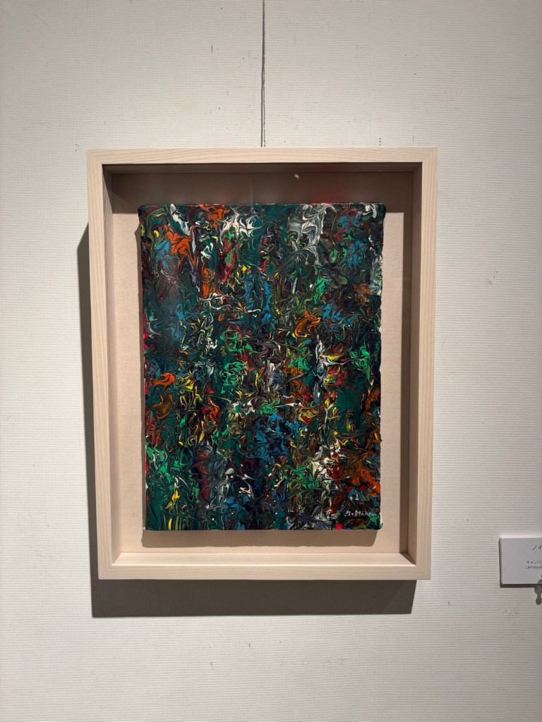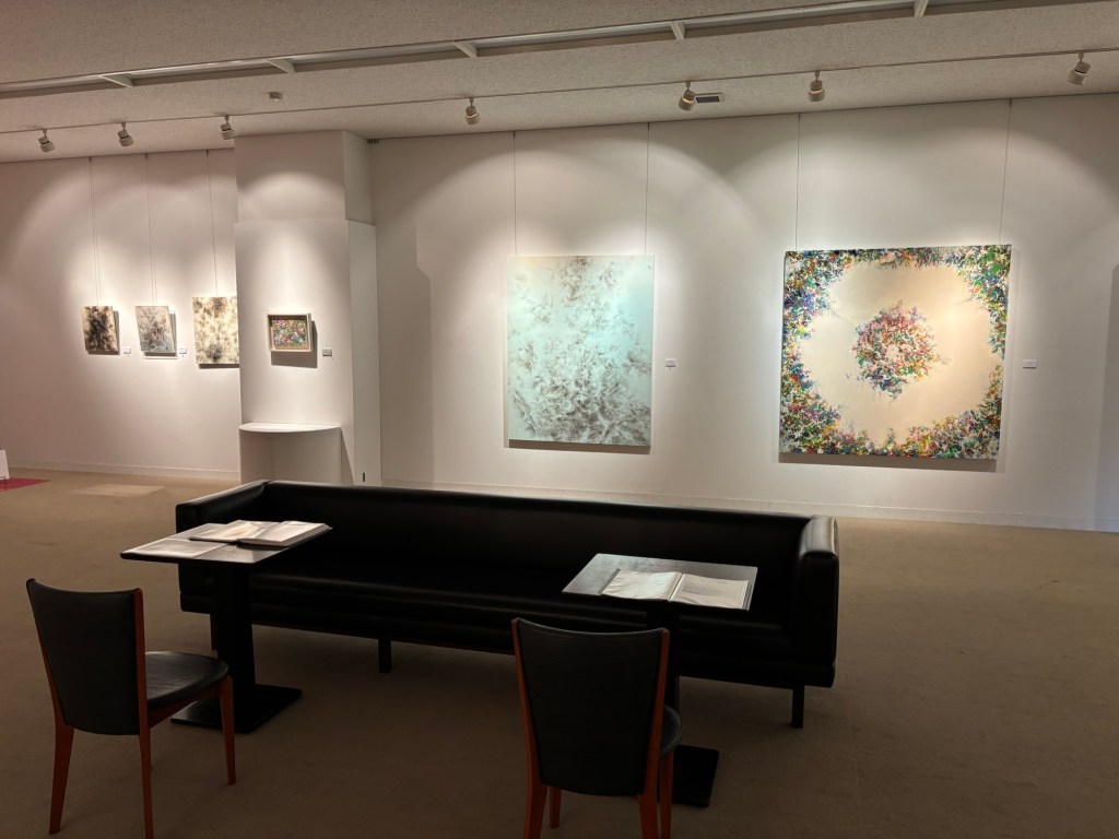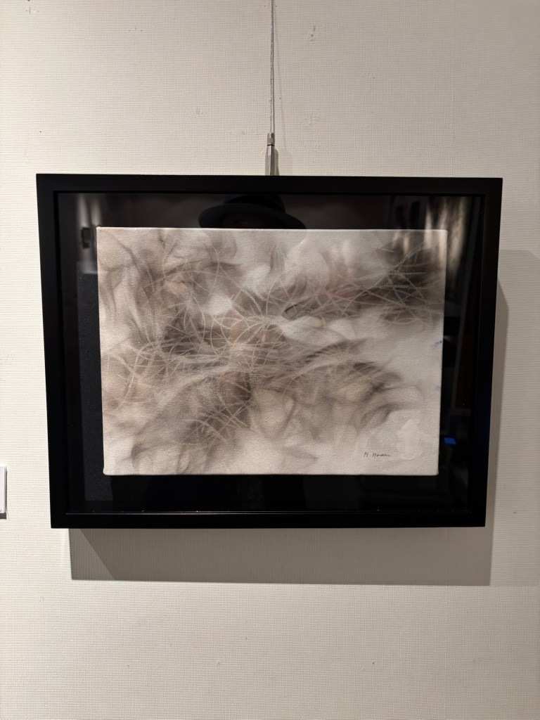 私は4年前より「生命」を主題の根底に据えて制作を続けてきました。制作過程においては、まずエスキースを通じて構想を構築し、描き始める前に一定のイメージを立ち上げます。しかしながら、10年来探究している独自の技法――炎を直接画面にあて、煤を焼き付けることで漆黒を定着させる方法――を用いると、焔の揺らぎが予期せぬ形象を生み出し、当初想定したイメージとは異なる世界へと移行していきます。その後、偶然性に導かれながら多様な道具によって黒を削ぎ落とし、生命の気配を探る過程において、初期のイメージはしばしば消失し、全く異なる形態へと変容したり、あるいは深化を経て再び顕現したりします。私はこの過程において混沌の迷宮に深く沈潜し、時間をかけて探究した末に、新たな形態として浮上するのです。