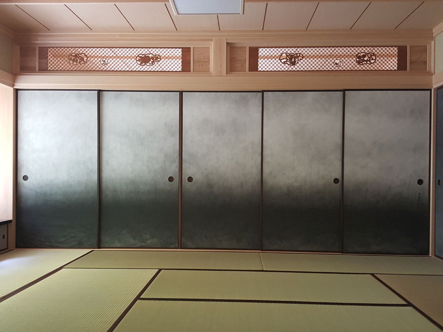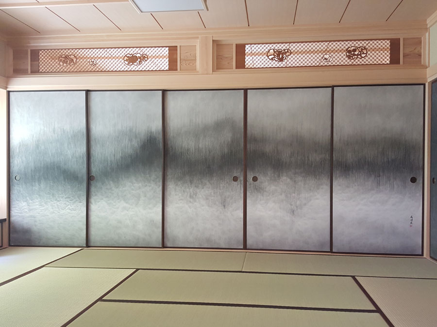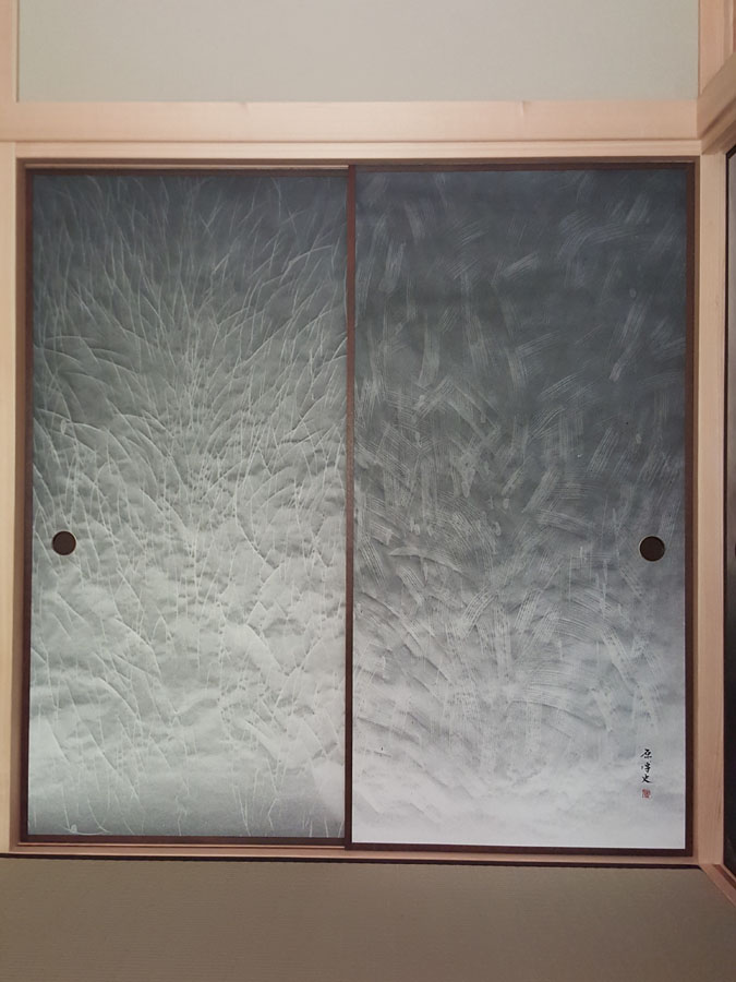 会館東側の仏間に面した襖絵には、「水」の情景が描かれています。