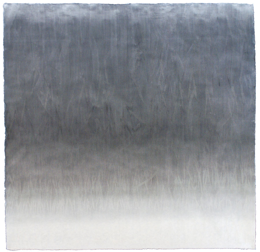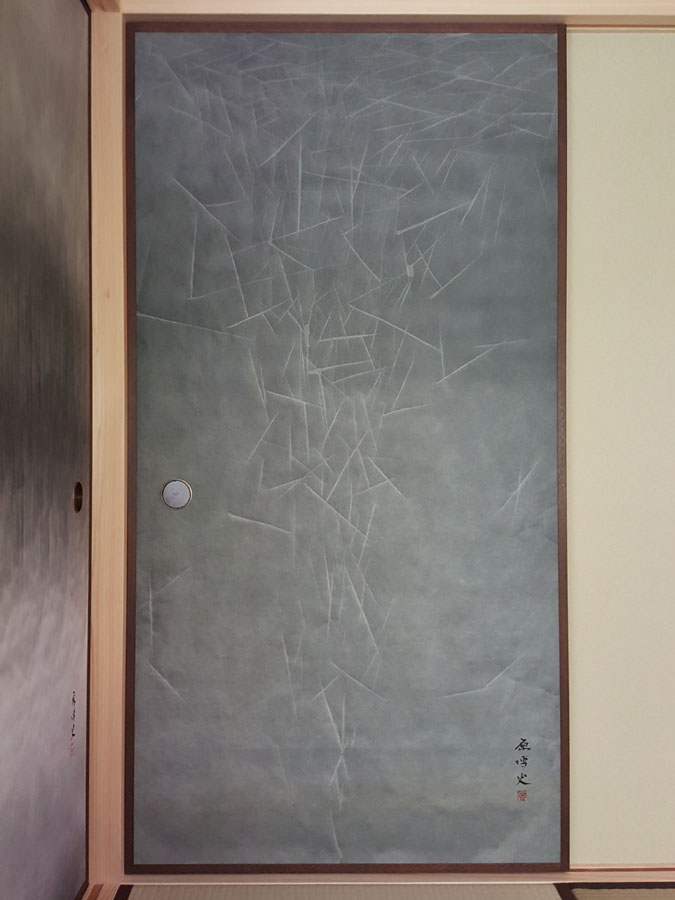 私は、和紙にドーサ液でドローイングを施し、そこへ墨や藍を吹き付けることで、その痕跡を浮かび上がらせる技法を用いている。