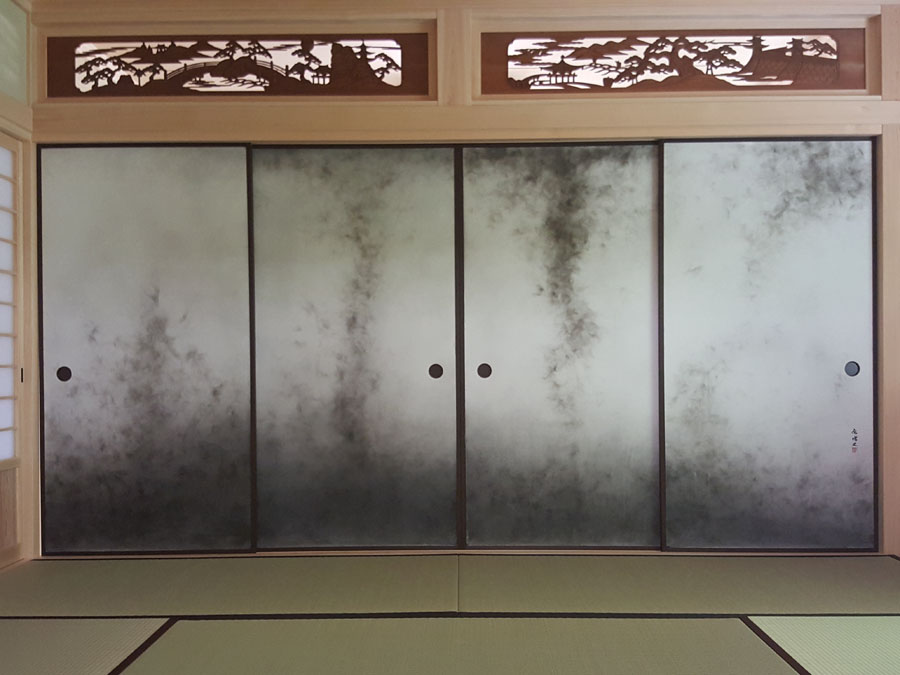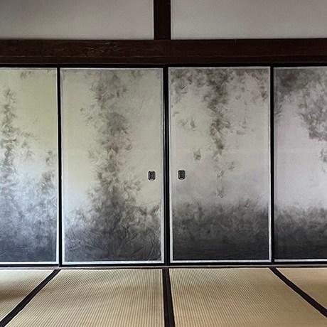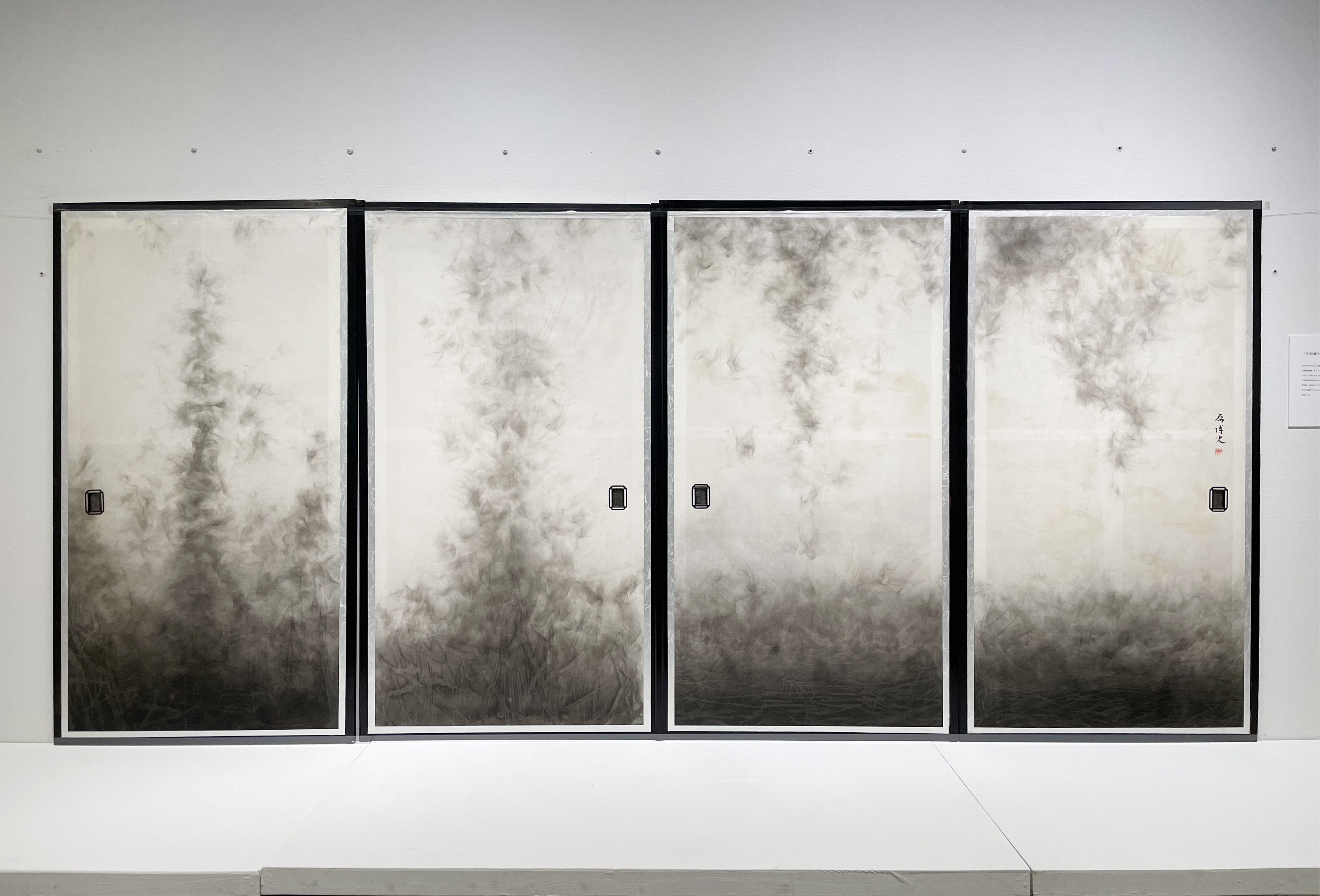Since 2015, I have embarked on a new artistic endeavor: capturing soot—born from the oily smoke used in traditional ink-making—directly onto washi paper and canvas. Through this process, I have been able to express black in its most infinitesimal, particulate form. The soot takes on shapes that appear as though they are impressions of flame itself—manifestations of fire made visible.