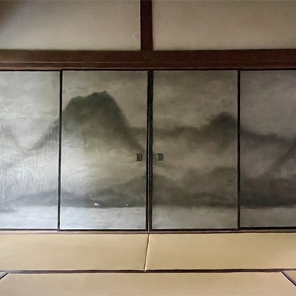 Facing the center of the Jōdan-no-ma is a sliding-door painting inspired by Byōbugaura, a place referenced in Kōbō Daishi’s early work Sankyō-shiki (The Indications of the Three Teachings).