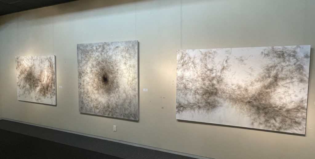 もう一点は、お寺に安置されている鎌倉期の不動尊像「金刀比羅不動迦楼羅像」をイメージして制作したものです。これは、具象ではなく私が独自の技法として用いている油煙を直接定着させる技法で描いています。炎を直接、支持体に当てた時、瞬間的に冷えることで生じる油煙のフォルムが不動のイメージと結びつき描きました。